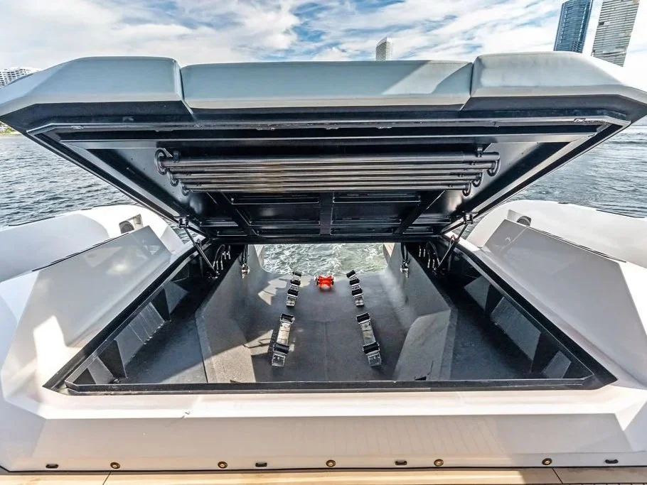 Shir's extensive equipment list includes features typically found on much larger vessels: a massive tender garage with an electric winched-release system, air compressor, Seakeeper, and a sophisticated electrical system with Victron components.