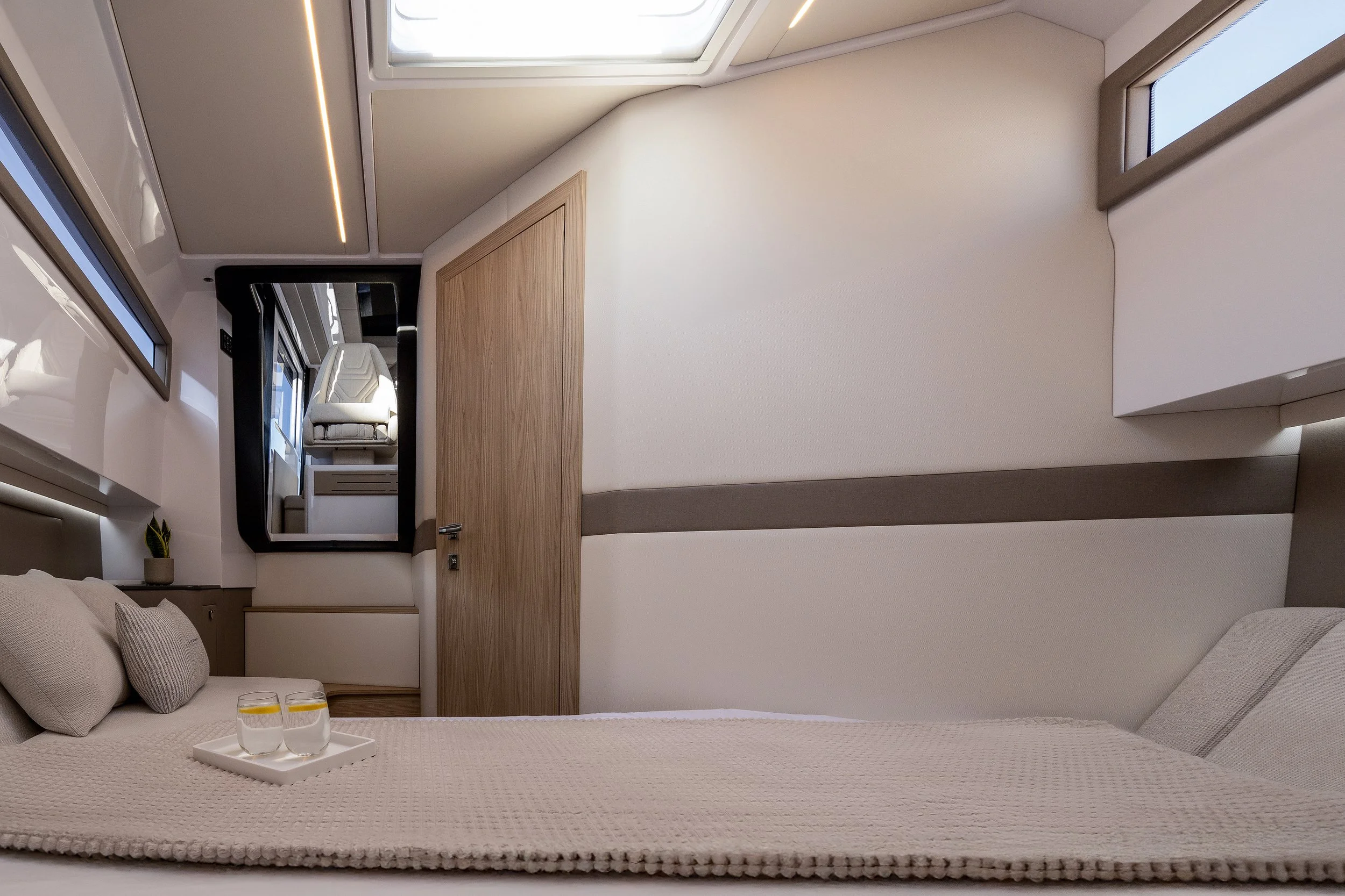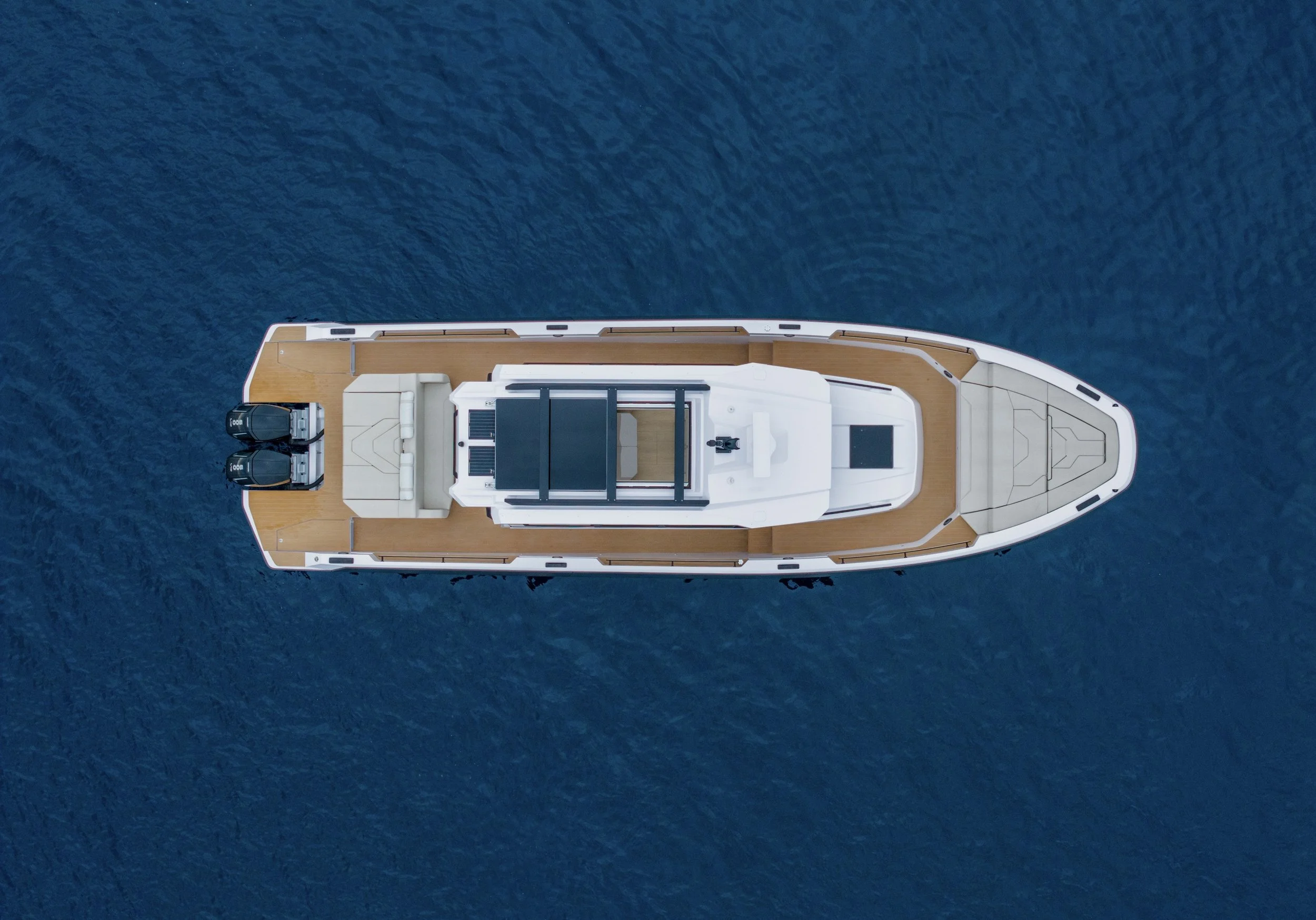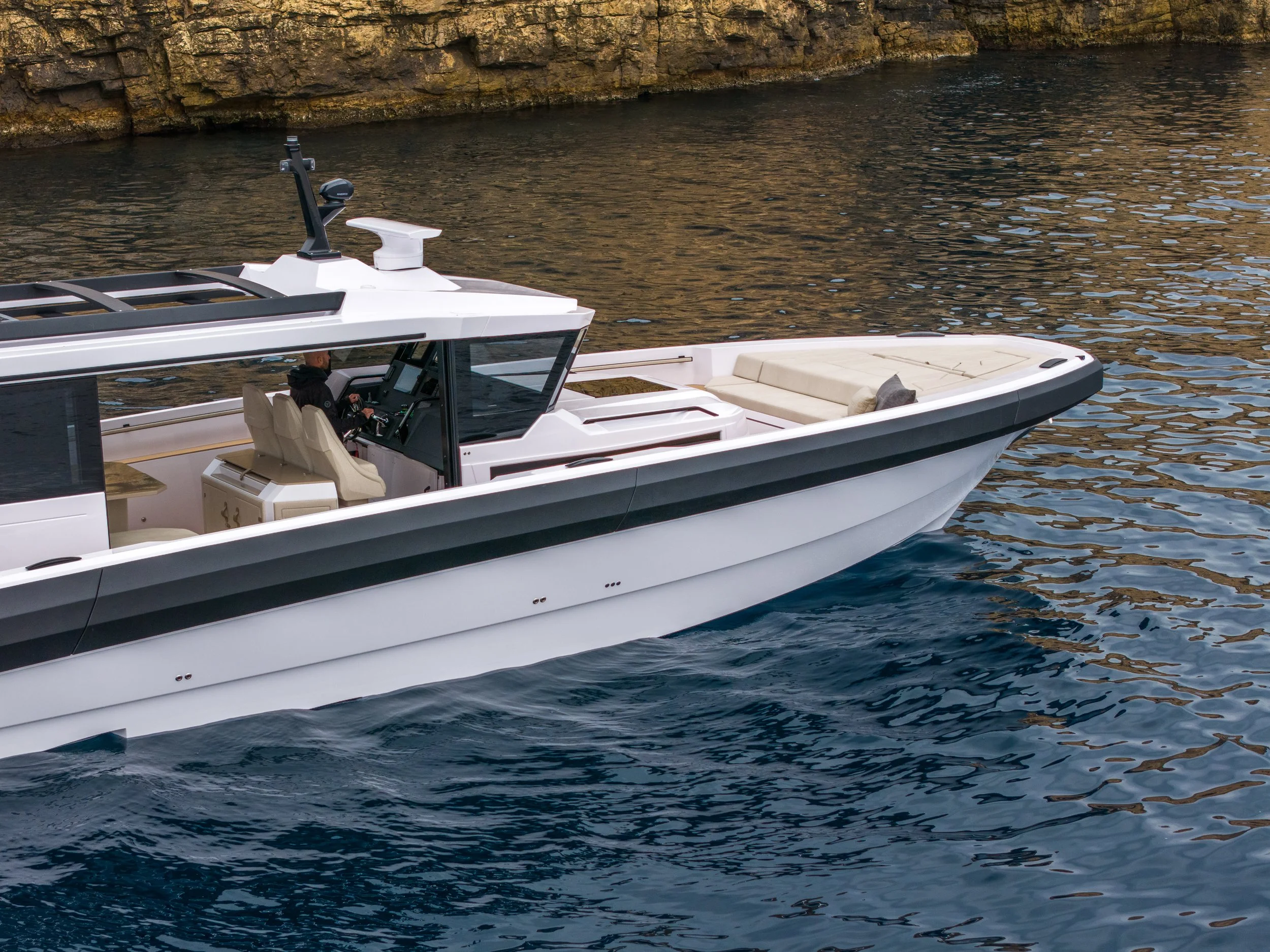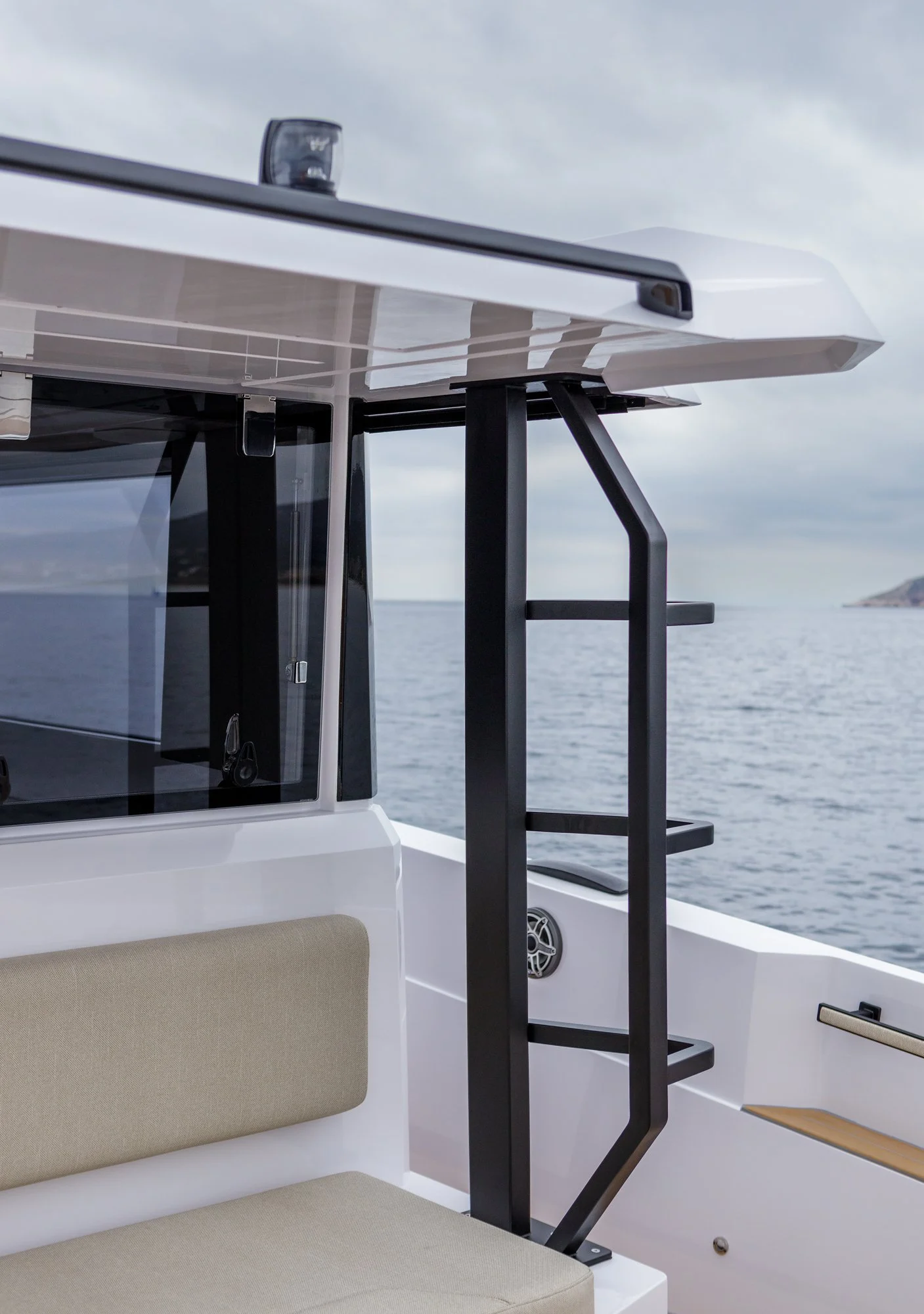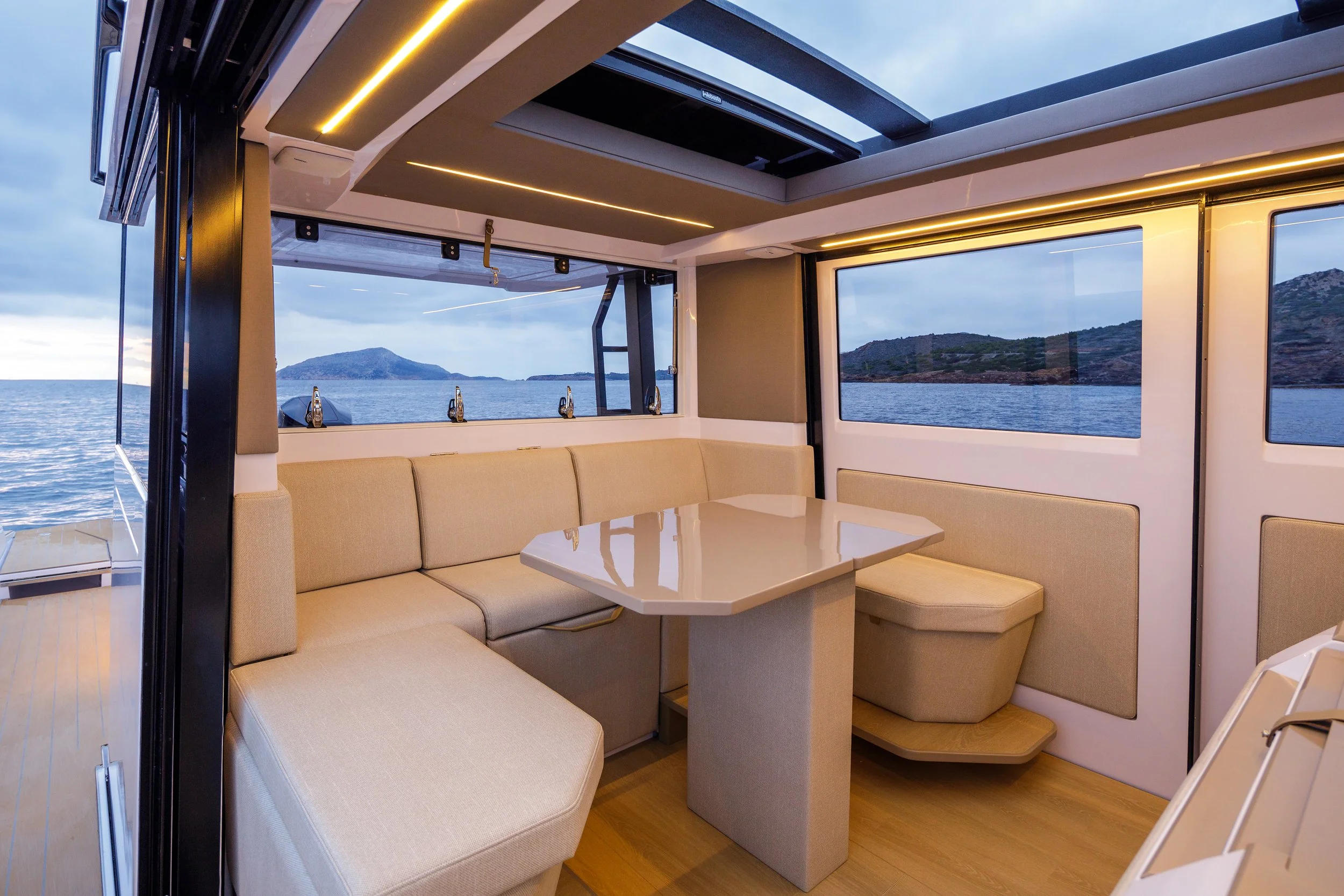 The convertible touches of the central superstructure (cabin) are all class: fully retractable and motorized sliding doors, a sliding roof, and an aft window that opens completely. The space transforms from buttoned-up cruiser to open-air lounge without compromise.