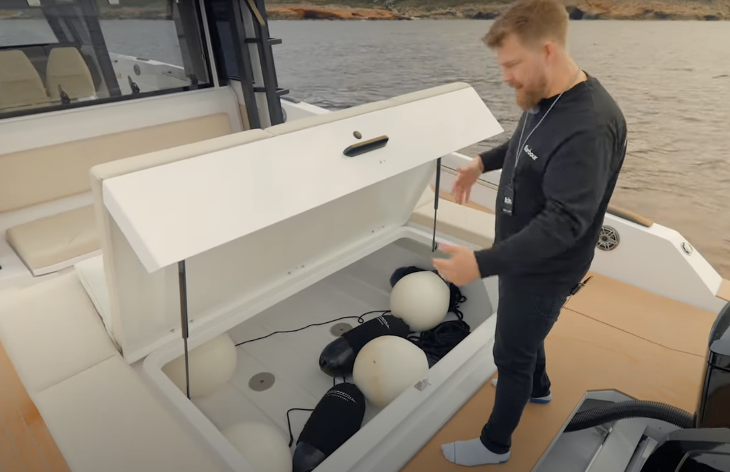 Here's where the XPD subtly shines: storage. The island sunbed opens from both sides: a classic access to the technical space from the bow side, plus an aft opening that offers sizable storage for sea bobs, water toys, inflatables, fenders and lines. Combined with the roof racks, you can keep all your daily toys completely out of the way.