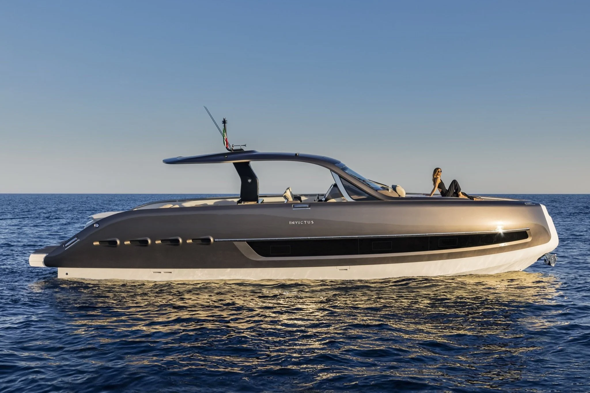 Simple is as simple does. Say what you will about the rest of the boat (its a love/hate thing), but the hardtop of the Invictus 460 is a perfect match to the hull below. It’s semi-seductive. There is no beginning or end to the windshield and hardtop, just one smooth structure fulfilling both needs. And as the structure continues aft, soft lines and inset LEDs make it nearly disappear from your consciousness.