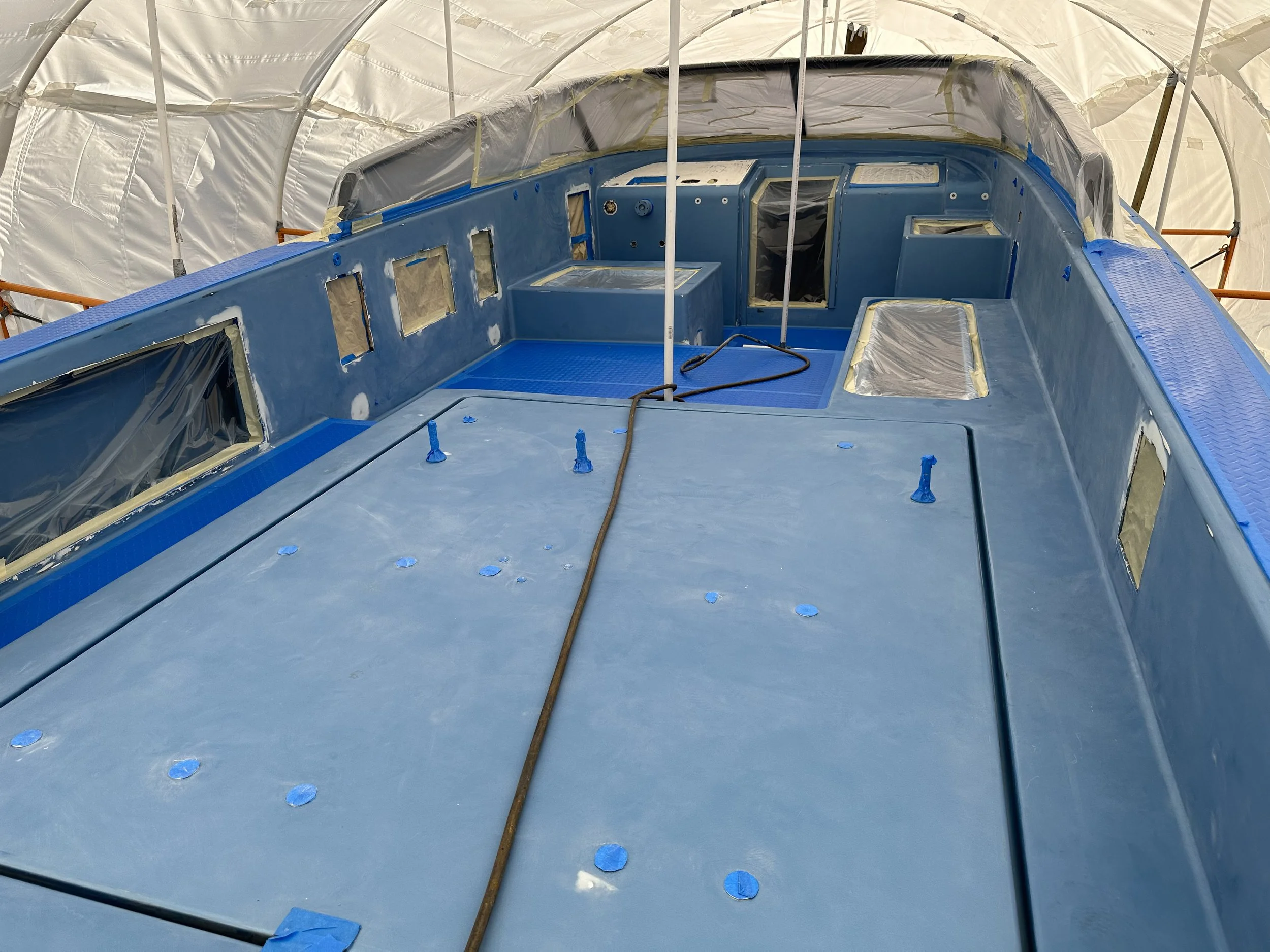 The project cruised along before 10 days of rain paused the spraying of our hull color. Those 10 days laid siege to a schedule that had been in place for 8 weeks. We’d worked inside a warehouse until it was time to paint, but alas, mother nature made her mark on the project when she had the chance.